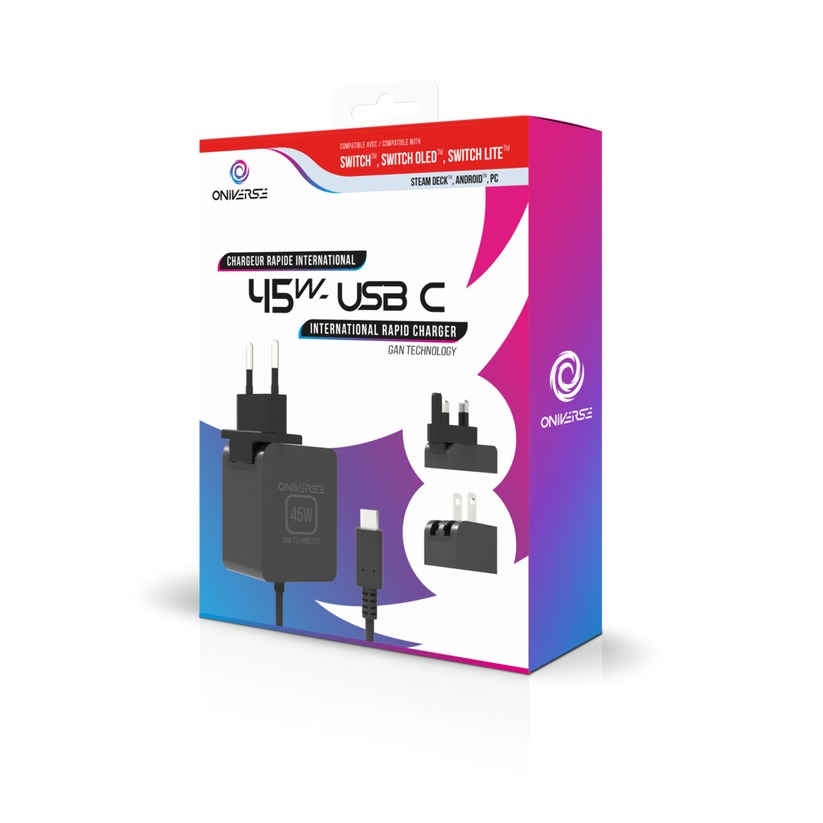 Recharge your Nintendo Switch to 100% in less than 3 hours with this AC adapter. Also compatible Steam DeckTM, Android devices, and laptops, with its 1.5 meter USB C cable and its charging power up to 45W. Gallium Nitride (GaN) technology for maximum power in a tiny device. Removable plugs.