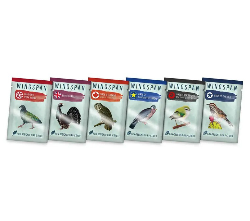 In cooperation with Elizabeth Hargrave, fan creation coordinator Travis Willse, and a few selected designers, Stonemaier Gaemes has officially printed some fan-designed bird promo packs. Each of the different 6 packs in this set feature 25 completely new birds in continents already covered by Wingspan (the art is consistent with the general style of other birds).
