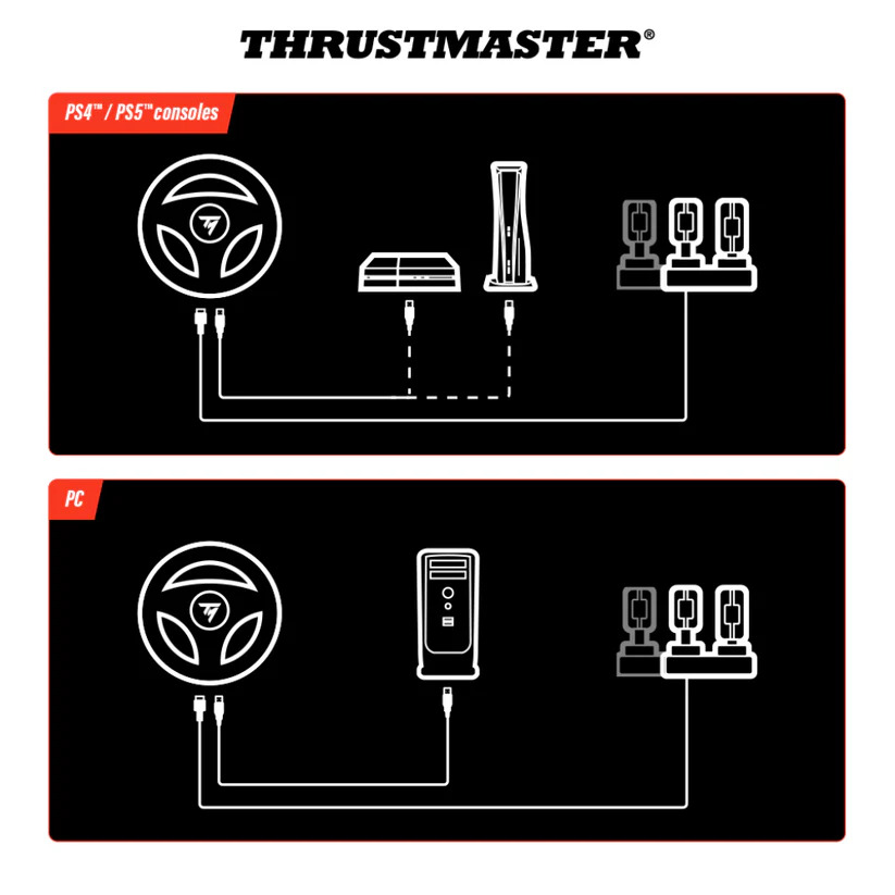 A 2-pedal pedal set with accelerator and brake is included. The pedals feature Thrustmasters patented H.E.A.R.T. Hall effect sensors to ensure that the product will retain its razor-sharp precision for years to come. The pedal sets compact design allows it to even be installed and used in small spaces.