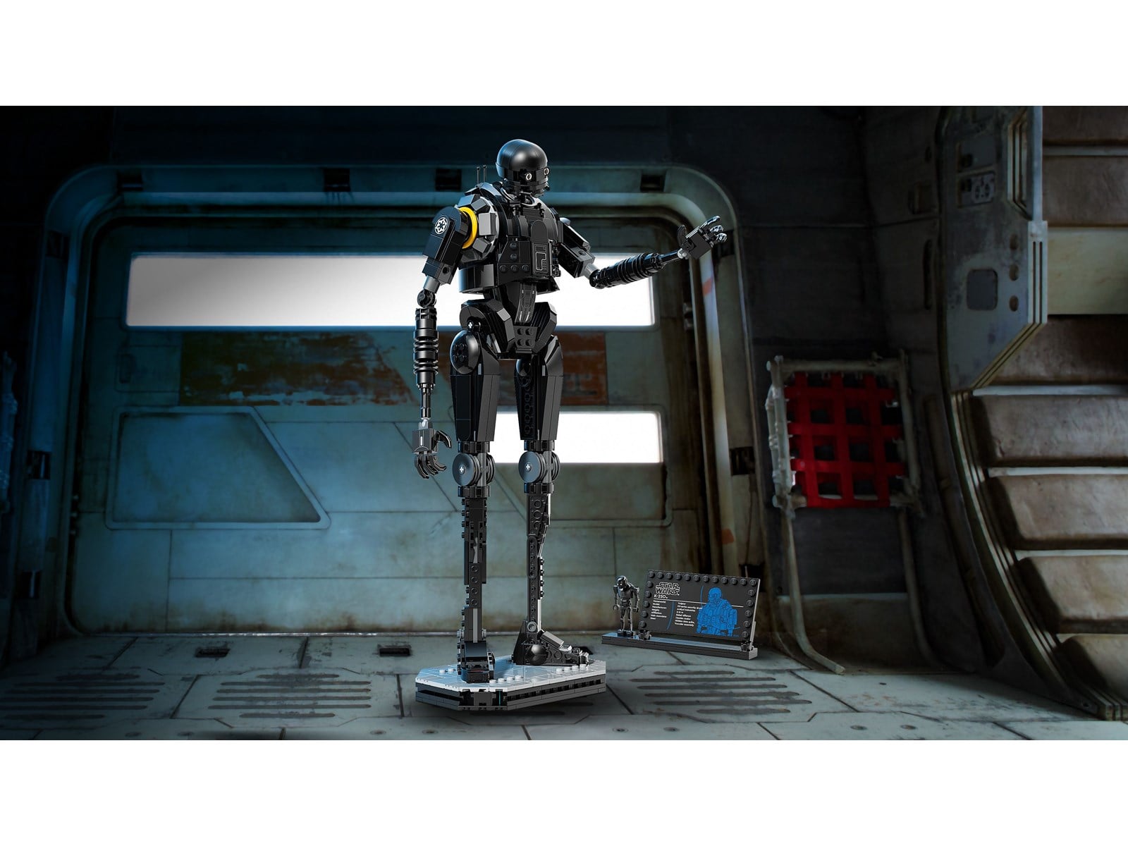 En LEGO® figur av K-2SO i standardstorlek plus en informationsskylt