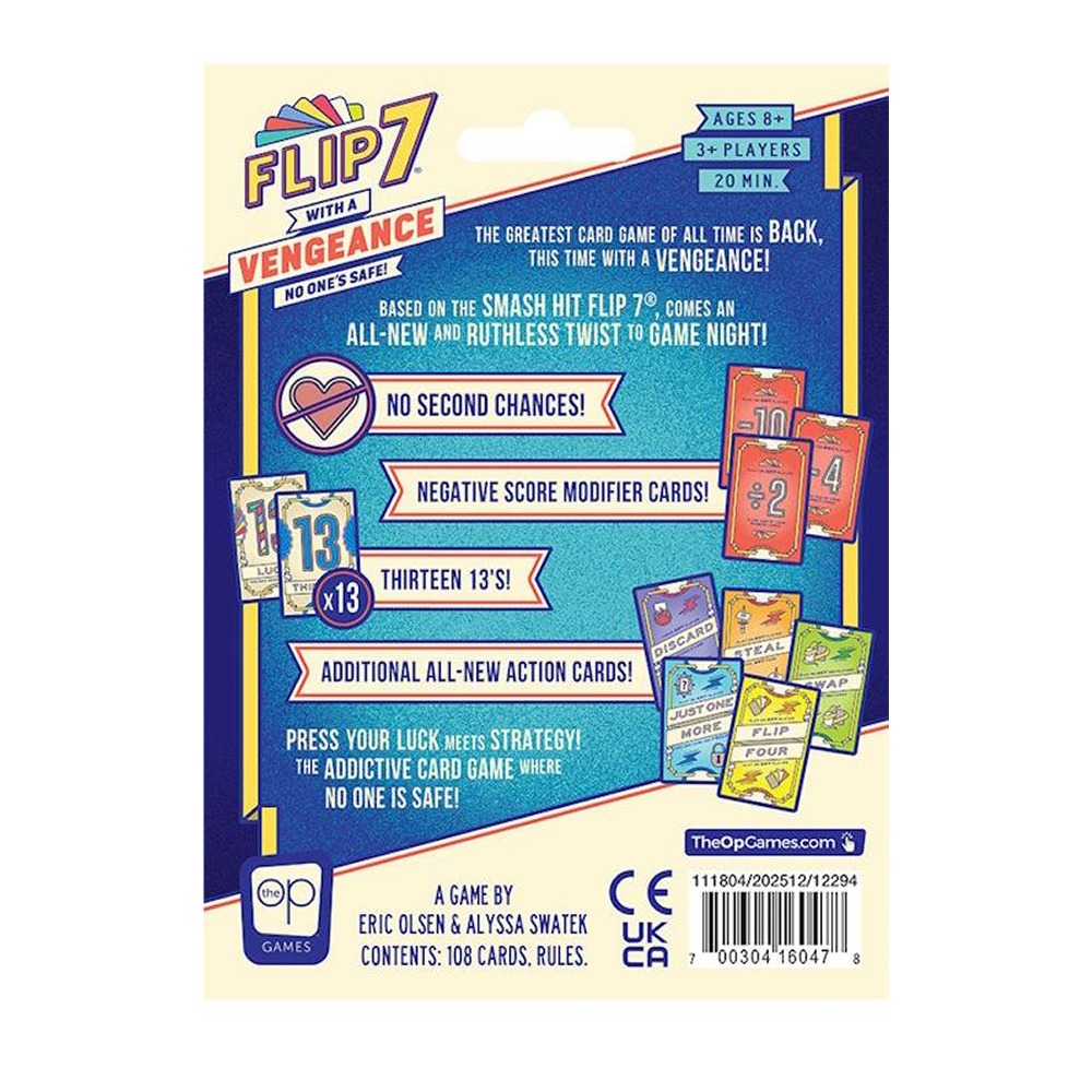 Flip 7: With a Vengeance bygger vidare på det enkla och beroendeframkallande systemet från originalet, men skruvar upp både spänning och spelarinteraktion. Resultatet är ett snabbt kortspel där tur, timing och modet att ta chanser avgör vem som går segrande ur spelet.