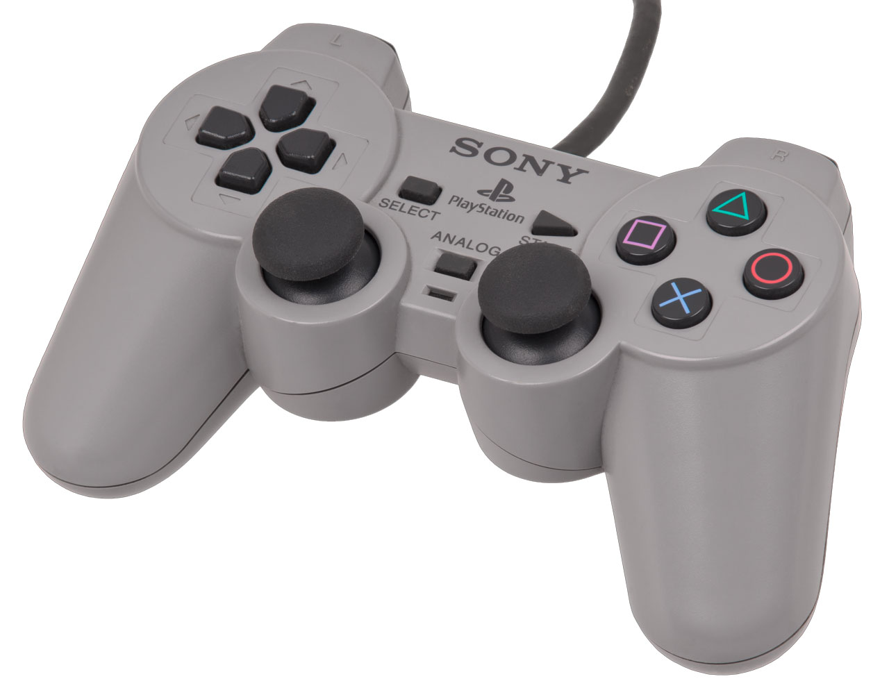 Like its predecessor, the Dual Analog controller, the DualShock controller has two analog sticks. However, unlike its predecessor, the DualShock controllers analog sticks feature textured rubber grips instead of the smooth plastic tips with recessed grooves found on the Dual Analog controllers analog sticks. There are also 2 additional buttons, L3 and R3, which are triggered by pressing the analog sticks down. Other ways to tell the Dual Analog from the DualShock is the longer grips/handles, and slightly different L2/R2 buttons found on the Dual Analog.