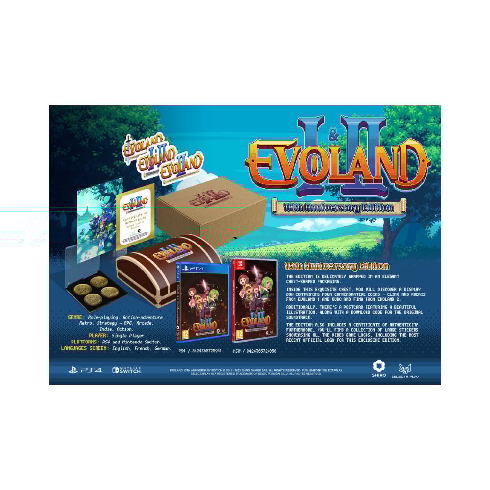 This edition comes packaged in a special box with the 10th-anniversary logo printed on the lid. Upon opening it, youll find an elegant treasure chest containing your exclusive items. Within this chest, discover a display box containing four commemorative coins of Clink and Kaeris from Evoland 1, and Kuro and Fina from Evoland 2. In addition, theres a beautifully illustrated postcard together with a download code for the original soundtrack. This edition also comes with a certificate of authenticity. Plus, enjoy a collection of large stickers showing all the video game logos, including the latest official logo for this exclusive edition.