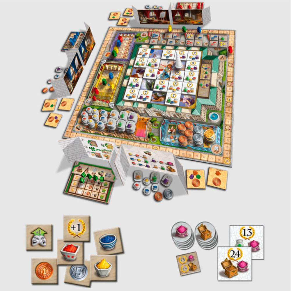 Then, players decide their actions for the turn, deploying their apprentice work force to various tasks. Youll need to buy paint, mix paint, work on painting the fresco, raise money (which youll need to buy the aforementioned paint!) by painting portraits, and perhaps even send your apprentices to the opera in order to increase their happiness. Points are scored mostly by painting the fresco, which requires specific combinations of paints, so youll need to buy and mix your paints wisely, in addition to beating other players to the paints and fresco segments you would like to paint.