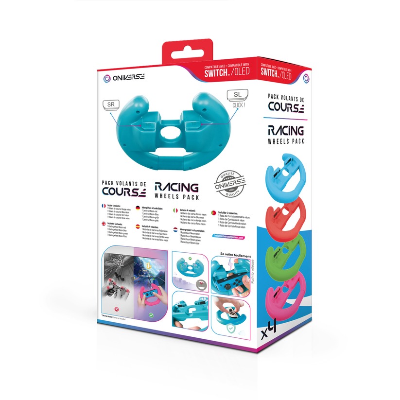 Pack 4 in 1 with 4 racing wheels for Nintendo Switch Joy-ConTM controllers. Racing wheel enhance gaming experience and have the user being a real pilot! Composed of the 4 classical neon colors from Nintendo Joy-ConTM : Red, Blue, Green and Pink. SL and SR extended triggers on wheel...