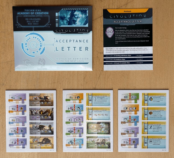 For each of the 15 main modules, there is one powerful additional tile for level 4. At the beginning of the game, each player drafts three of them. Accordingly, during the game, they can upgrade each of these three modules up to level 4 if they manage to.