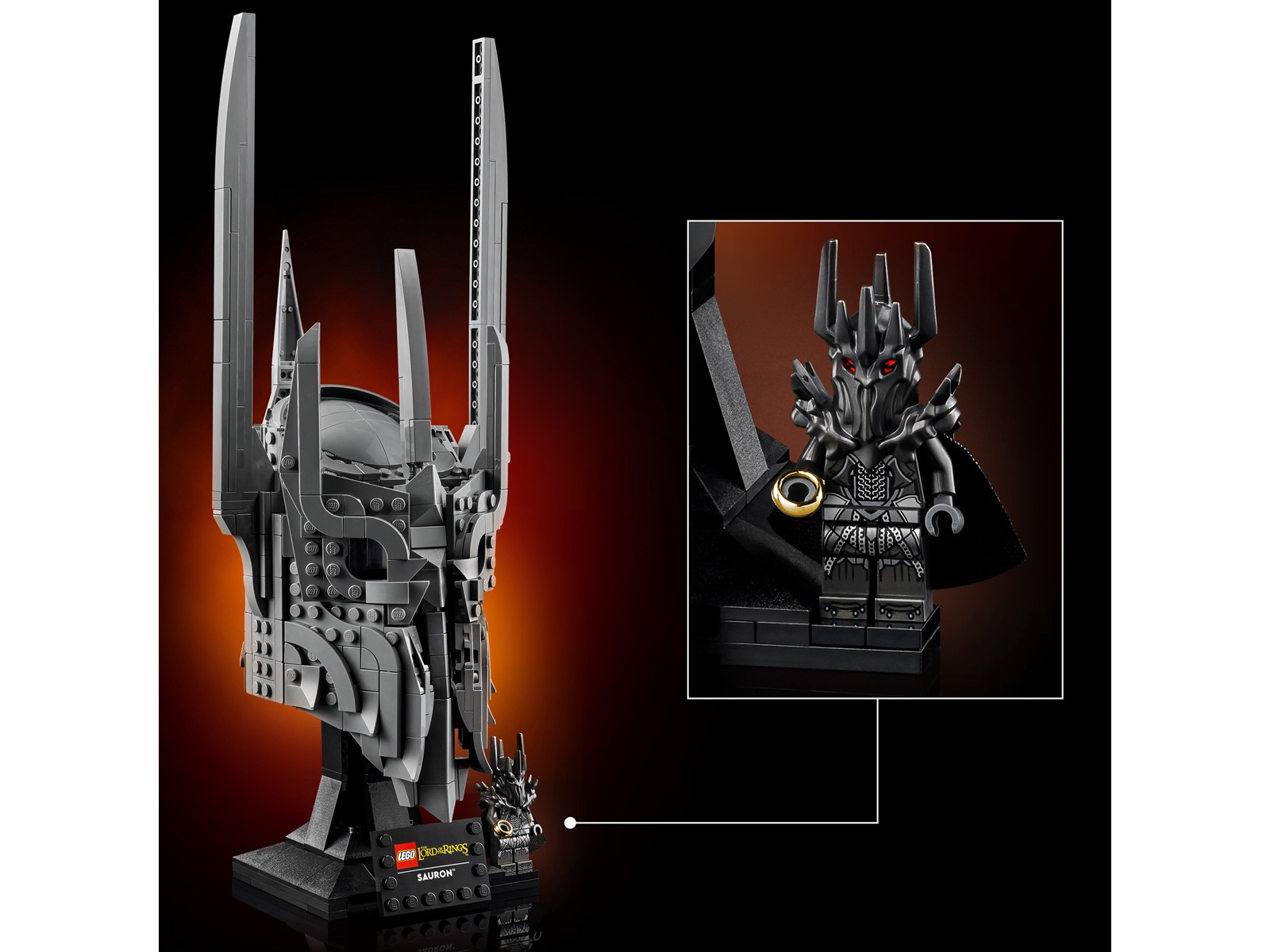 Setet innehåller även en Sauron-minifigur som håller Härskarringen samt ett stilrent svart displayställ för båda modellerna, komplett med namnskylt. Denna exklusiva utställningsmodell är en perfekt present för fans av The Lord of the Rings-filmerna och ett slående blickfång i hemmet eller på kontoret.