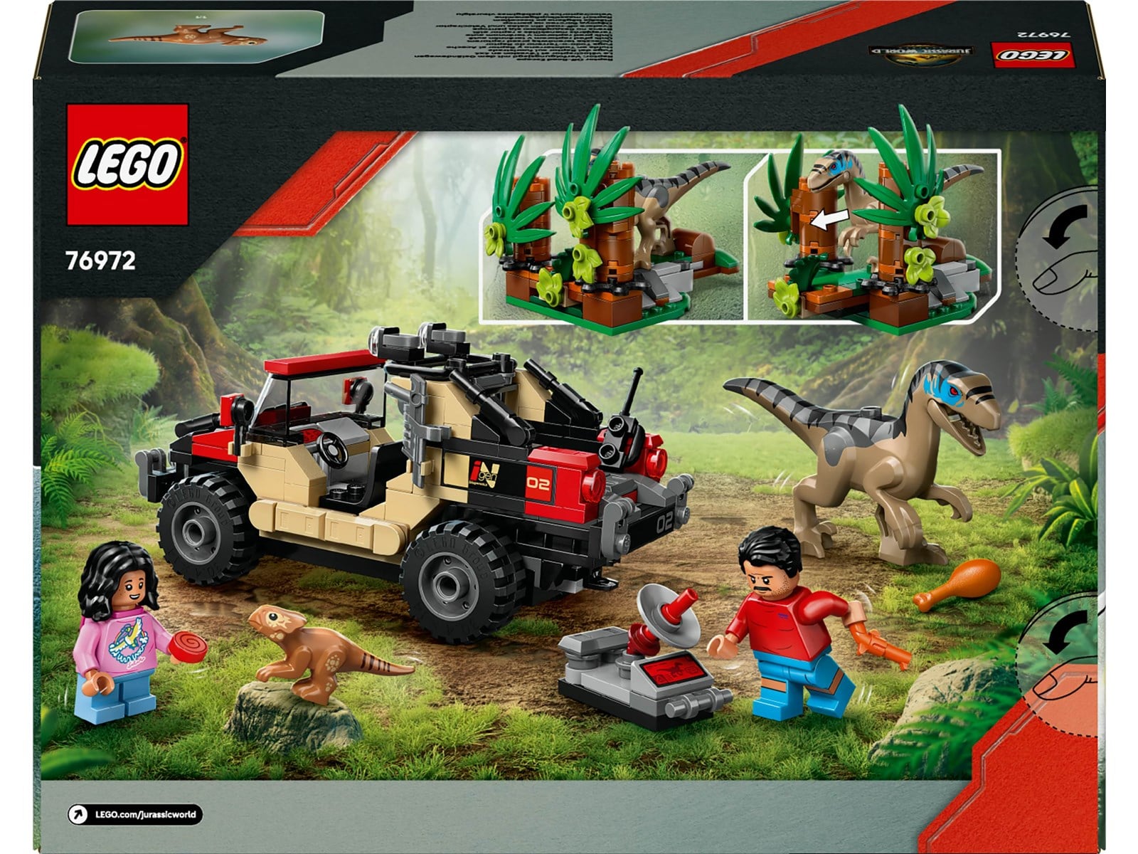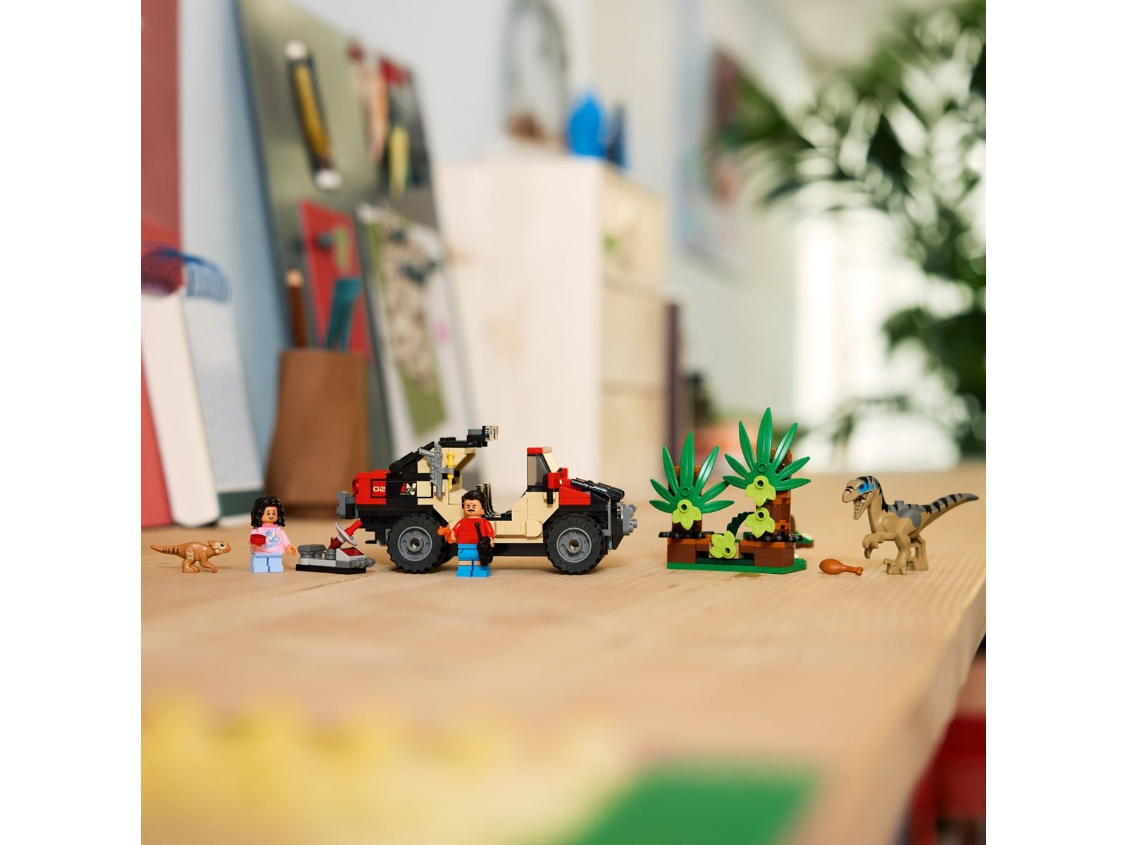 2 dinosaurier, 2 minifigurer, ett terrängfordon och en växt