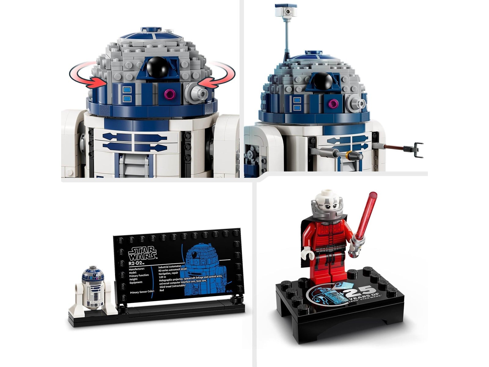 En LEGO® droidfigur av R2-D2 och en informationsskylt om R2-D2