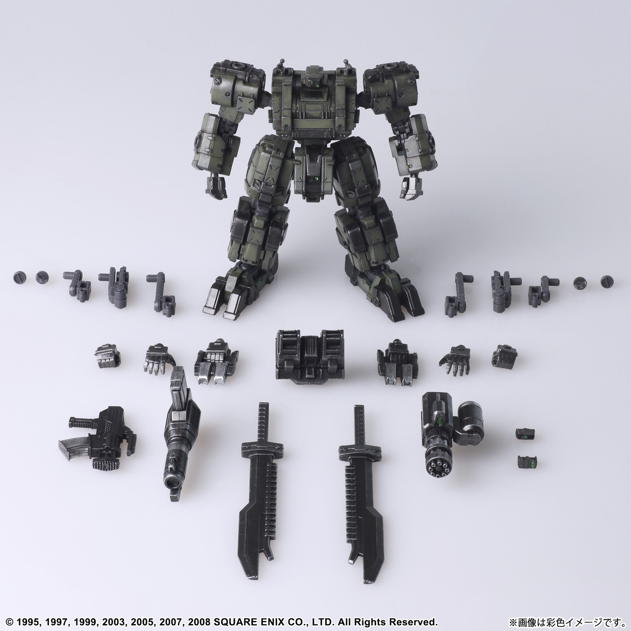 The NAMSEKAR FRONT MISSION STRUCTURE ARTS model is built at a 1/72 scale and can be used with miniature military figures and diorama displays of the same scale. We spared no effort in recreating the torso, arms, lower body, backpack, and hand-held weapons, which can all be swapped between the models in the series, and there is a total of four hardpoints on the shoulders and arms, allowing you to attach weapons and shields.