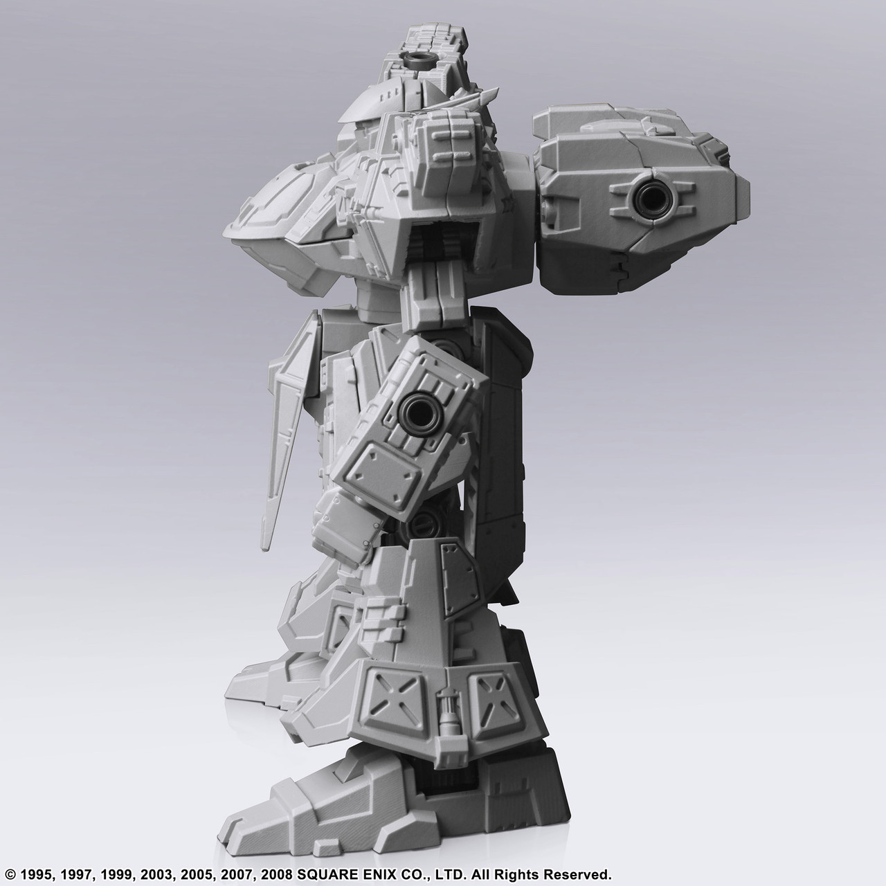 The ENYO FRONT MISSION STRUCTURE ARTS model is built at a 1/72 scale and can be used with miniature military figures and diorama displays of the same scale. We spared no effort in recreating the torso, arms, lower body, backpack, and hand-held weapons, which can all be swapped between the models in the series, and there is a total of four hardpoints on the shoulders and arms, allowing you to attach weapons and shields.