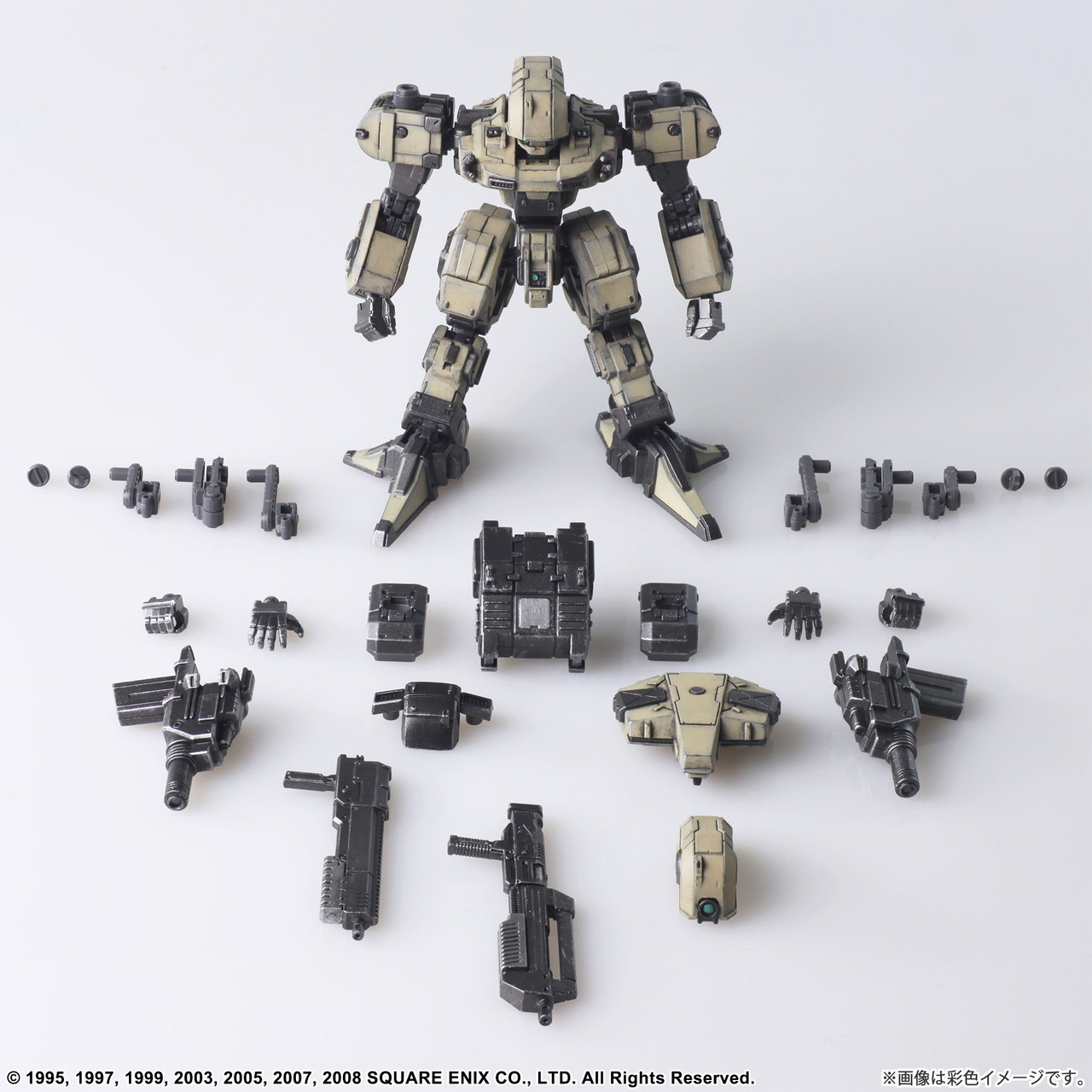 The GUST FRONT MISSION STRUCTURE ARTS model is built at a 1/72 scale and can be used with miniature military figures and diorama displays of the same scale. We spared no effort in recreating the torso, arms, lower body, backpack, and hand-held weapons, which can all be swapped between the models in the series, and there is a total of four hardpoints on the shoulders and arms, allowing you to attach weapons and shields.