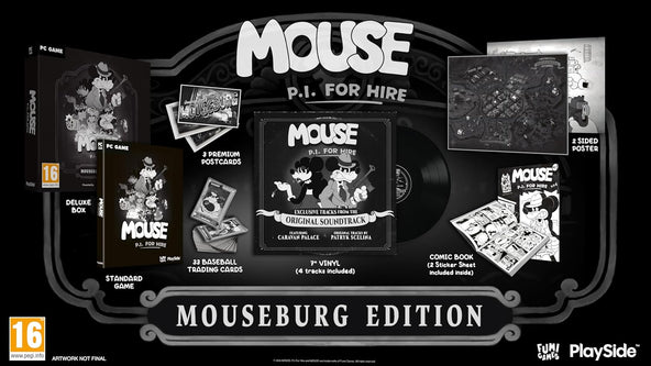 A printed MOUSE: P.I. For Hire Comic Book, including 2 sticker sheets, The video game (physical disc for PlayStation 5 and Xbox Series X, physical game-on cartridge for Nintendo Switch 2, and code-in-a box for PC)